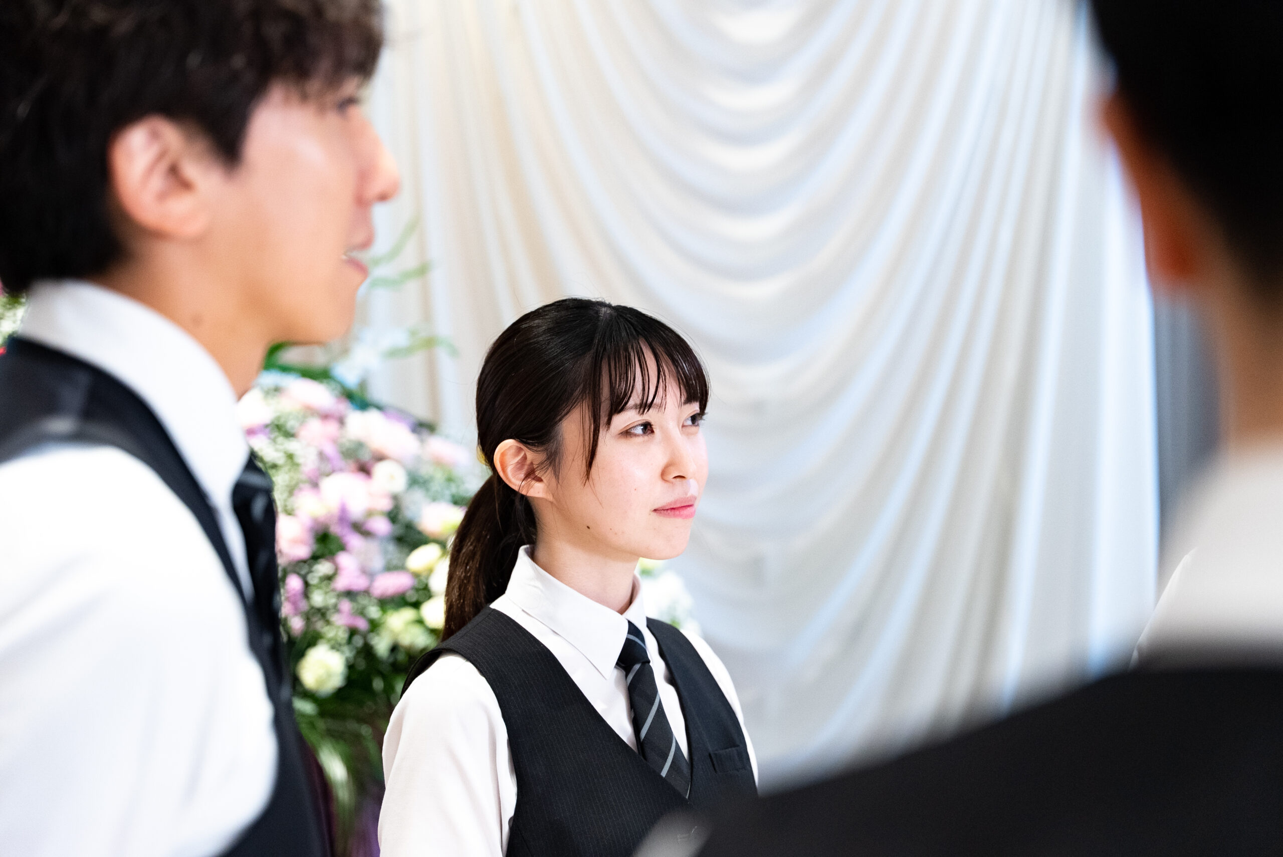 セレモニーの進め方や各種手続きの知識などを、先輩と一緒に仕事を進めながら覚えていきます。